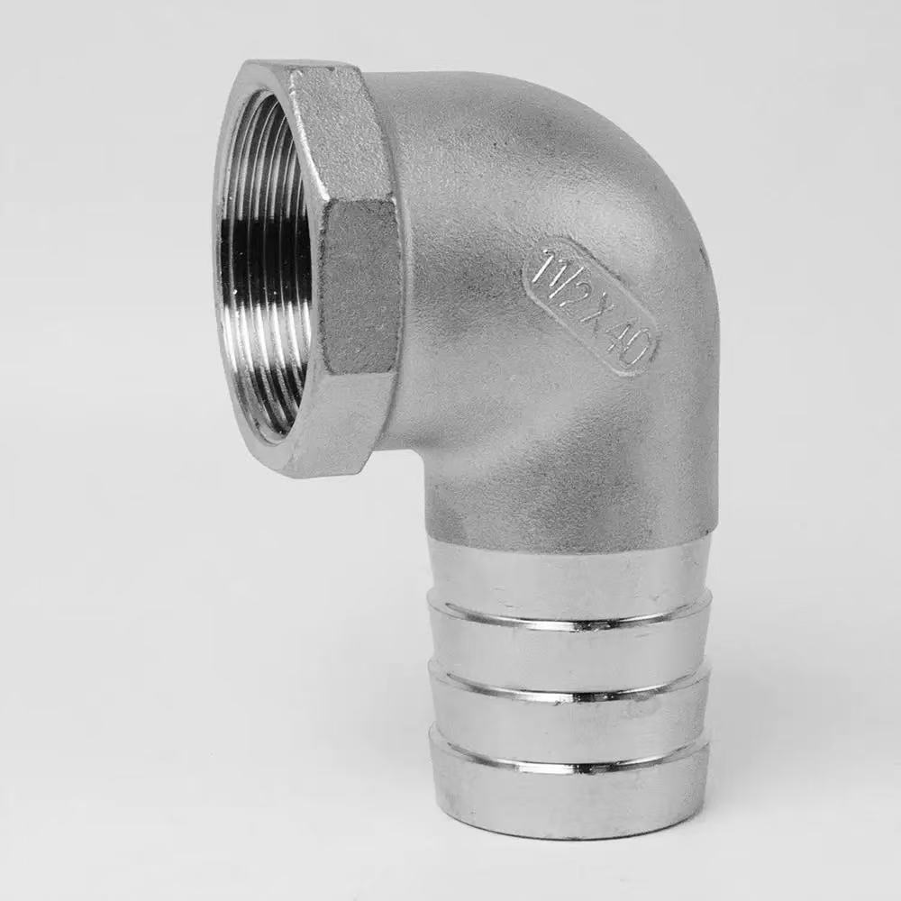 90도 암나사 팔꿈치 피팅:한쪽 끝에는 암나사산이 있고 다른 쪽 끝에는 가시 호스 피팅이 있으며 수나사산 부품에 연결하도록 설계되었습니다.